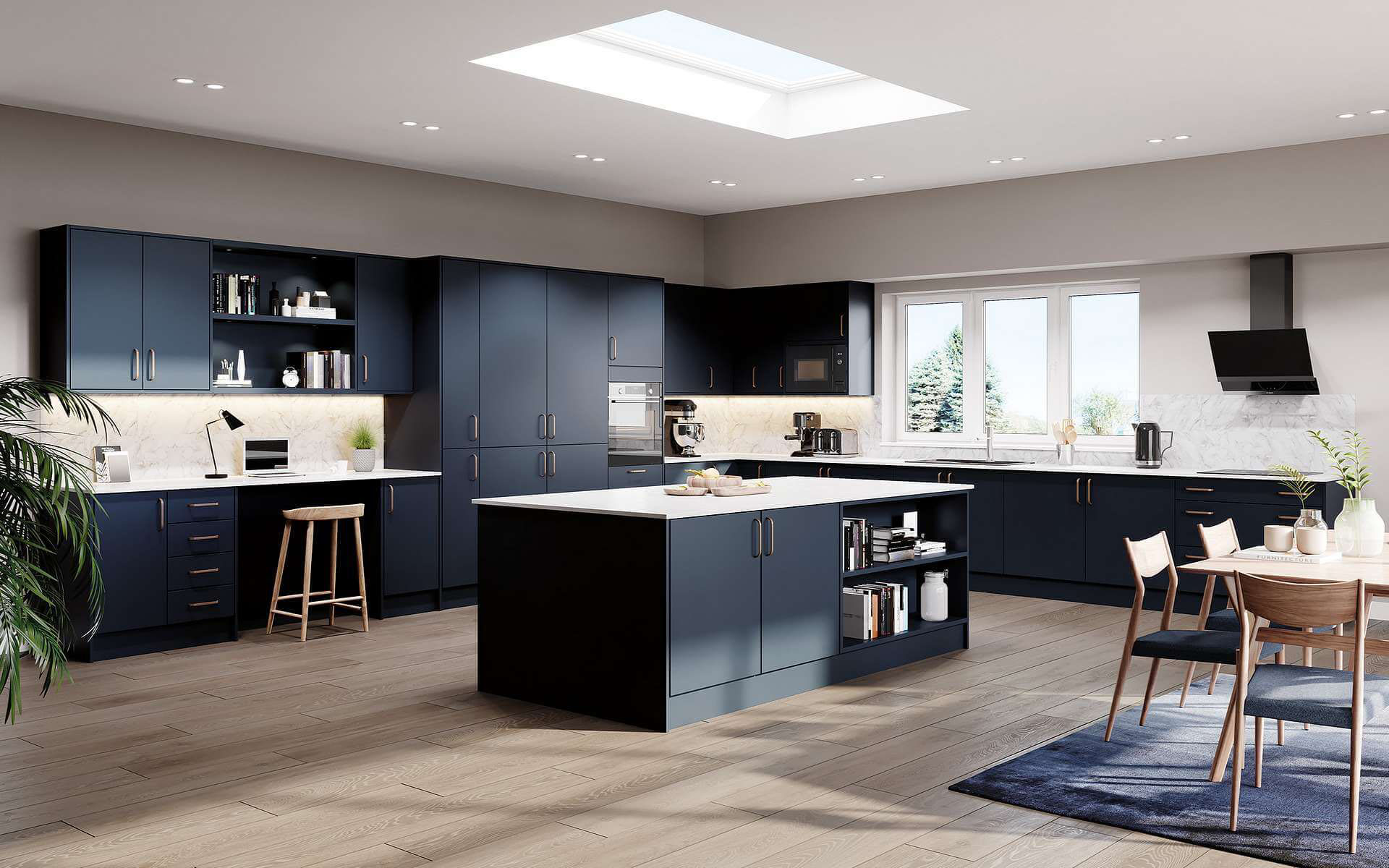 Balance Beauty and Usefulness: Select a central feature that looks good and improves your kitchen's efficiency. A good example is an eye-catching extractor hood, which serves the dual purpose of enhancing aesthetics while removing cooking odours.