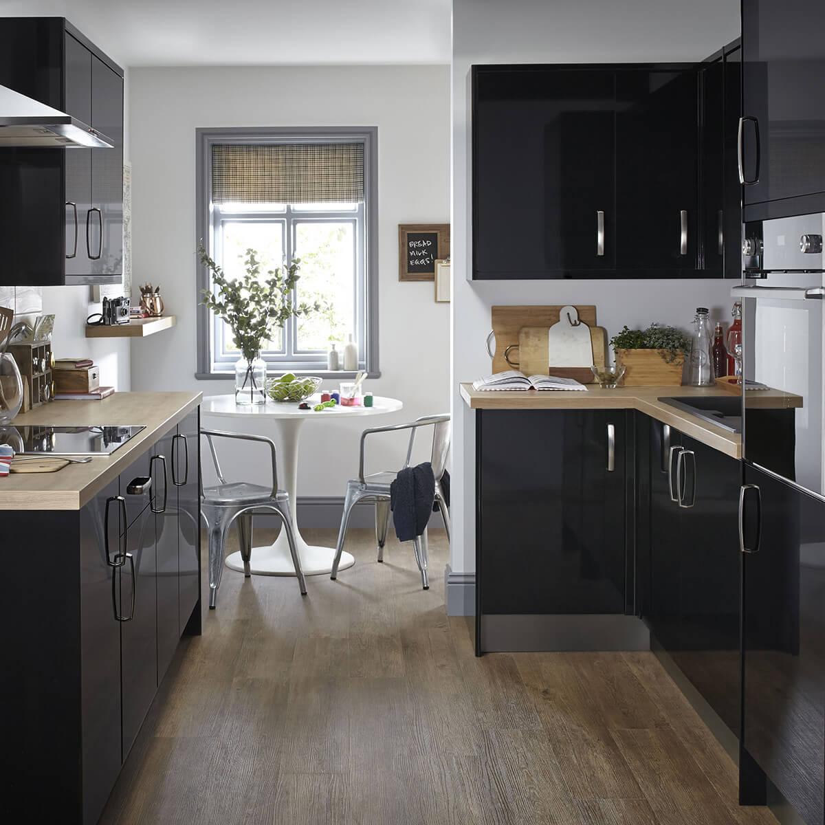 Black Gloss Kitchen with Wood Worktops.