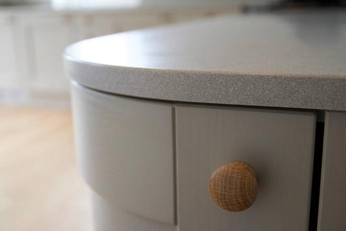 The grey solid surface worktops feature a fully integrated seamless sink and upstands, creating a sleek and harmonious look. Oak knobs beautifully complement the oak flooring, adding a touch of warmth to the space.