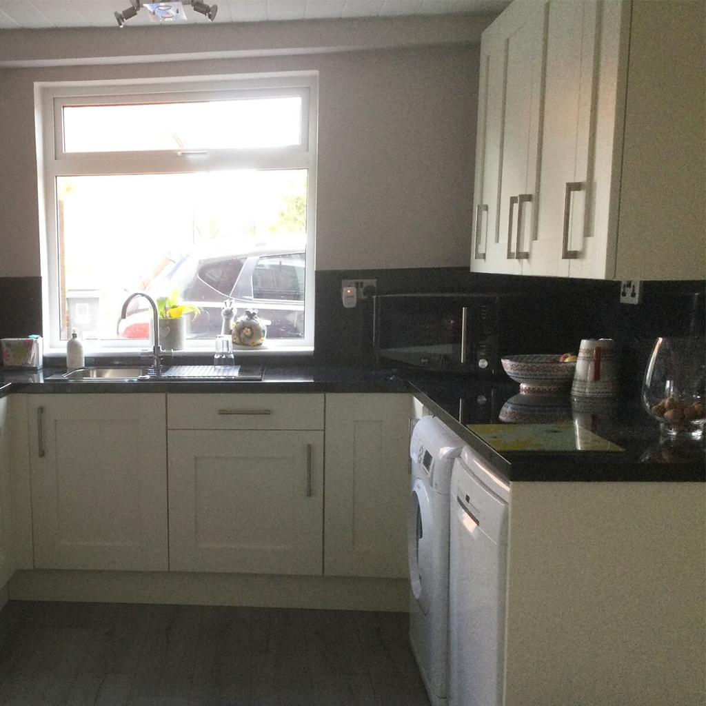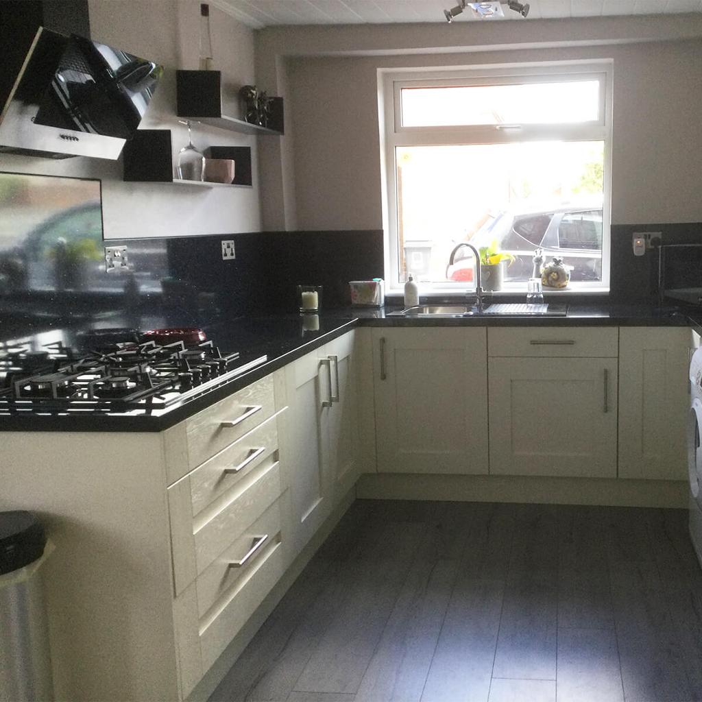 We are delighted to spotlight Bev’s sophisticated Lynmouth Ivory kitchen! The textured vinyl wrapped doors exhibit a genuine woodgrain effect, beautifully contrasted with sleek black worktops and a matching splashback.