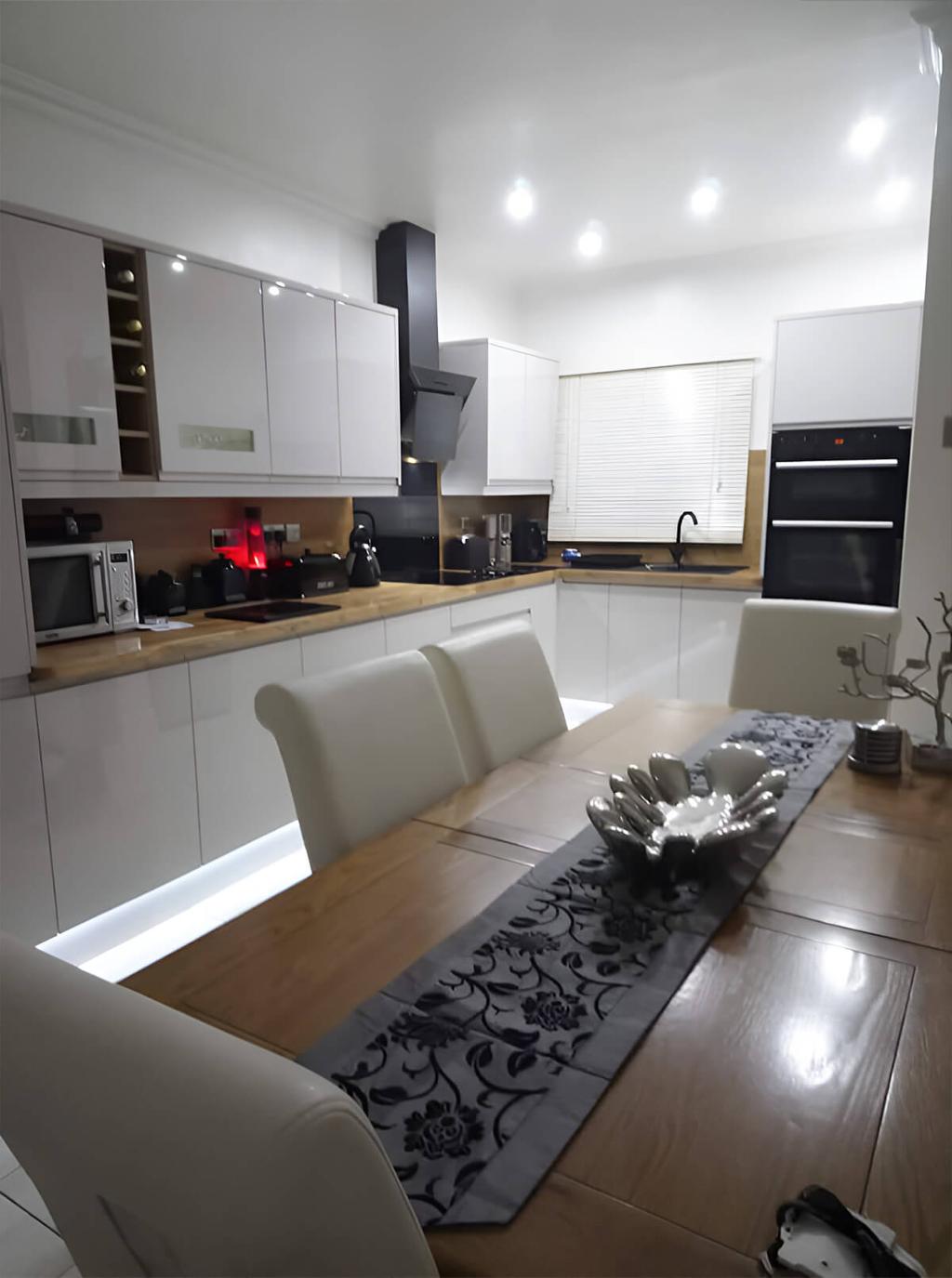 The under plinth lighting and angled extractor contribute to the kitchen’s sleek and stylish ambiance, making it a truly inviting and functional space!