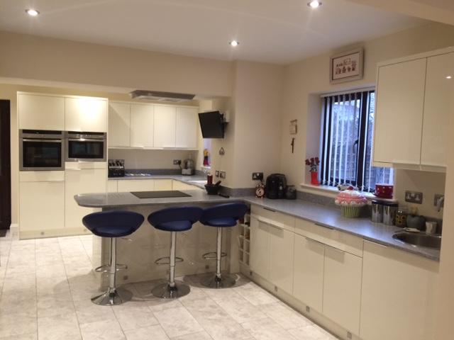 We are thrilled to present Dave & Jill’s sophisticated Treviso kitchen in Ivory Gloss! This elongated kitchen design features grey solid surface worktops, creating a sleek contrast.