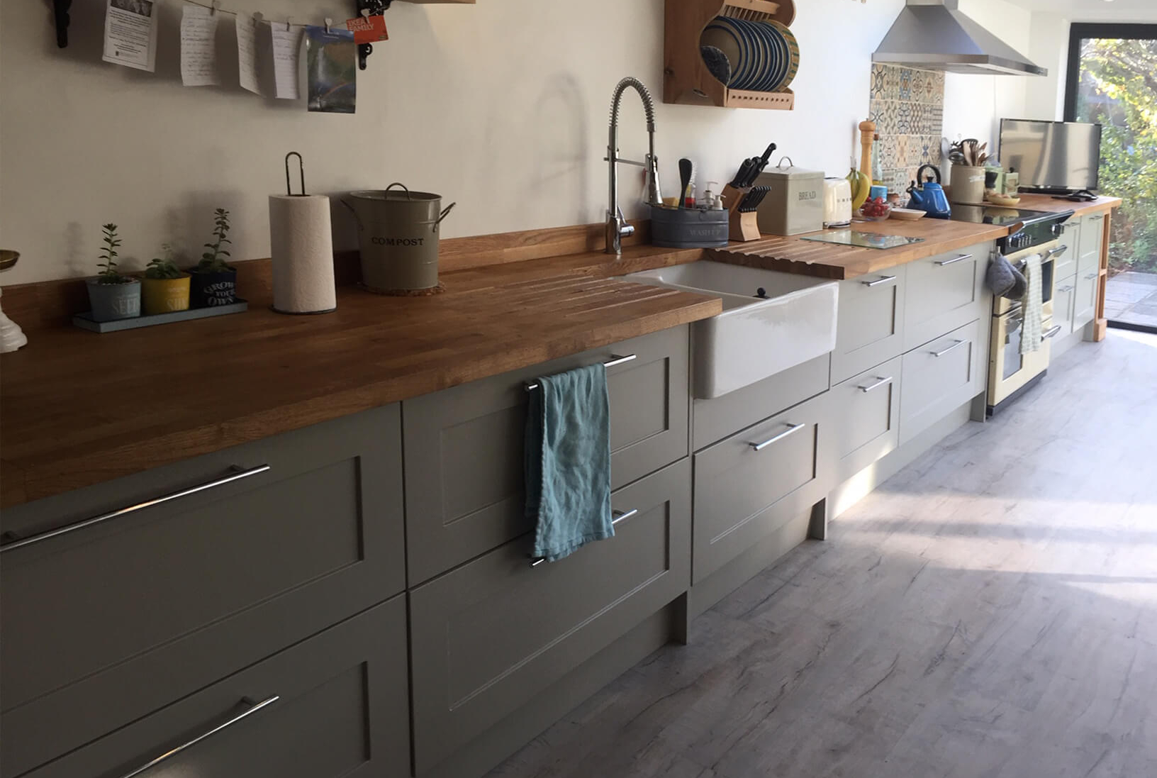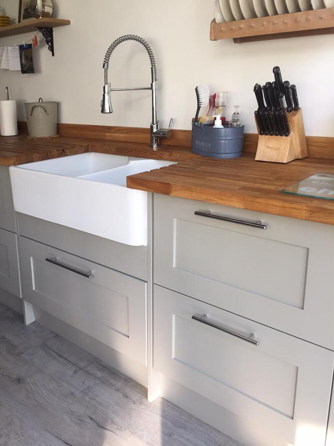 We are thrilled to feature Denise’s elegant Darlington kitchen in Dust Grey! The oak worktops and Belfast sink with draining grooves on both sides blend beautifully with the cream and black range cooker, set against a Moroccan-inspired tiled splashback.