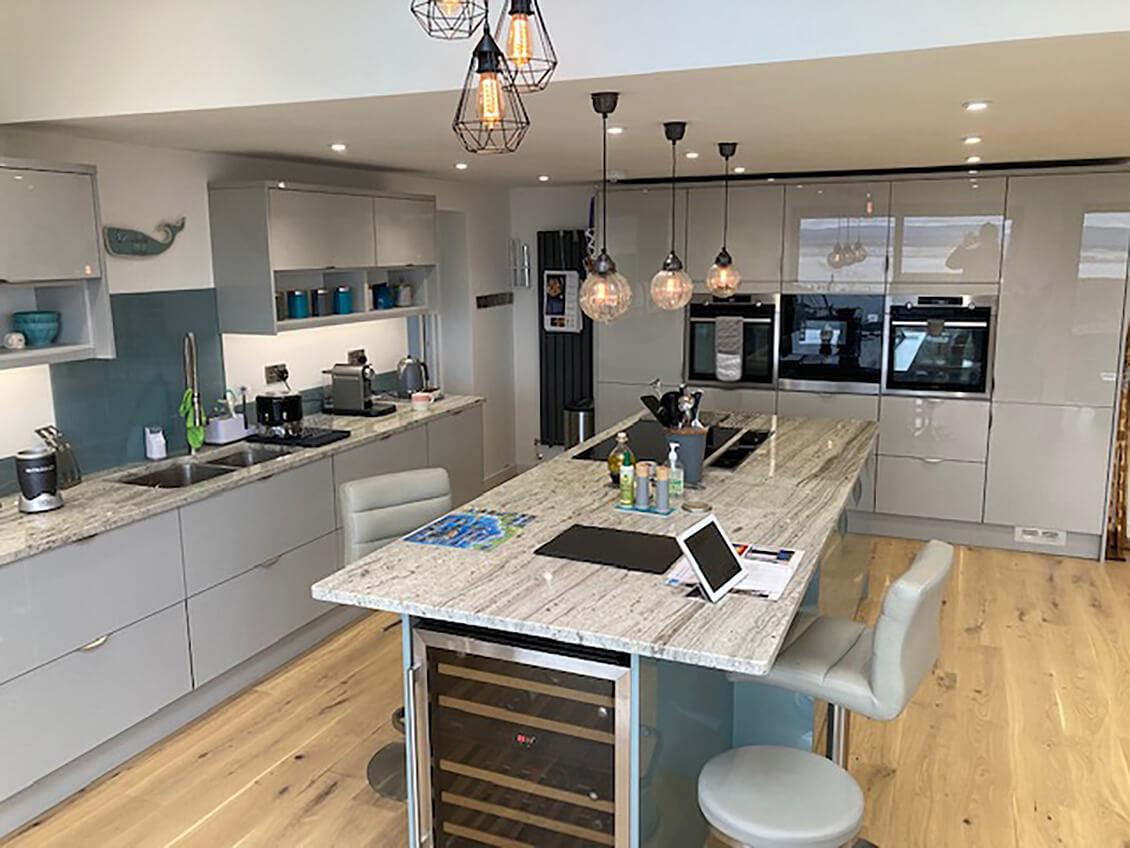 We’re delighted to present Eamonn’s sophisticated Treviso kitchen in Light Grey Gloss! The design boasts a large bank of five tall units, with the central three housing ovens, creating a focal point in the space.
