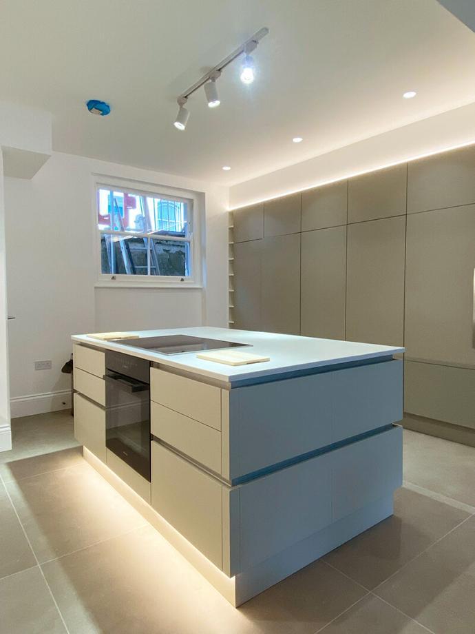We're thrilled to share Irfan's stunning kitchen in a chic Dakar shade. This open-plan marvel features a sophisticated island at its heart, surrounded by sleek handleless designs and innovative pan drawers that wrap elegantly around the edge.