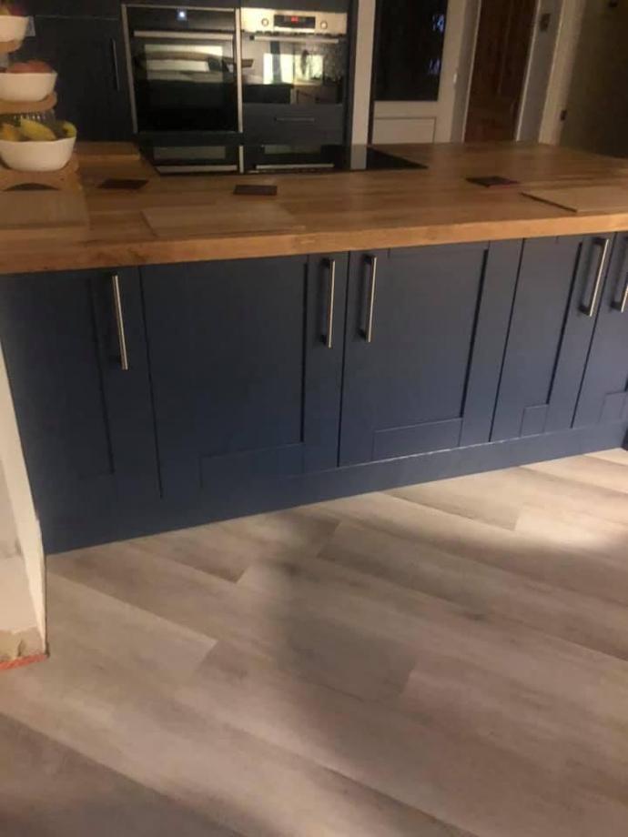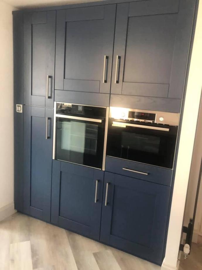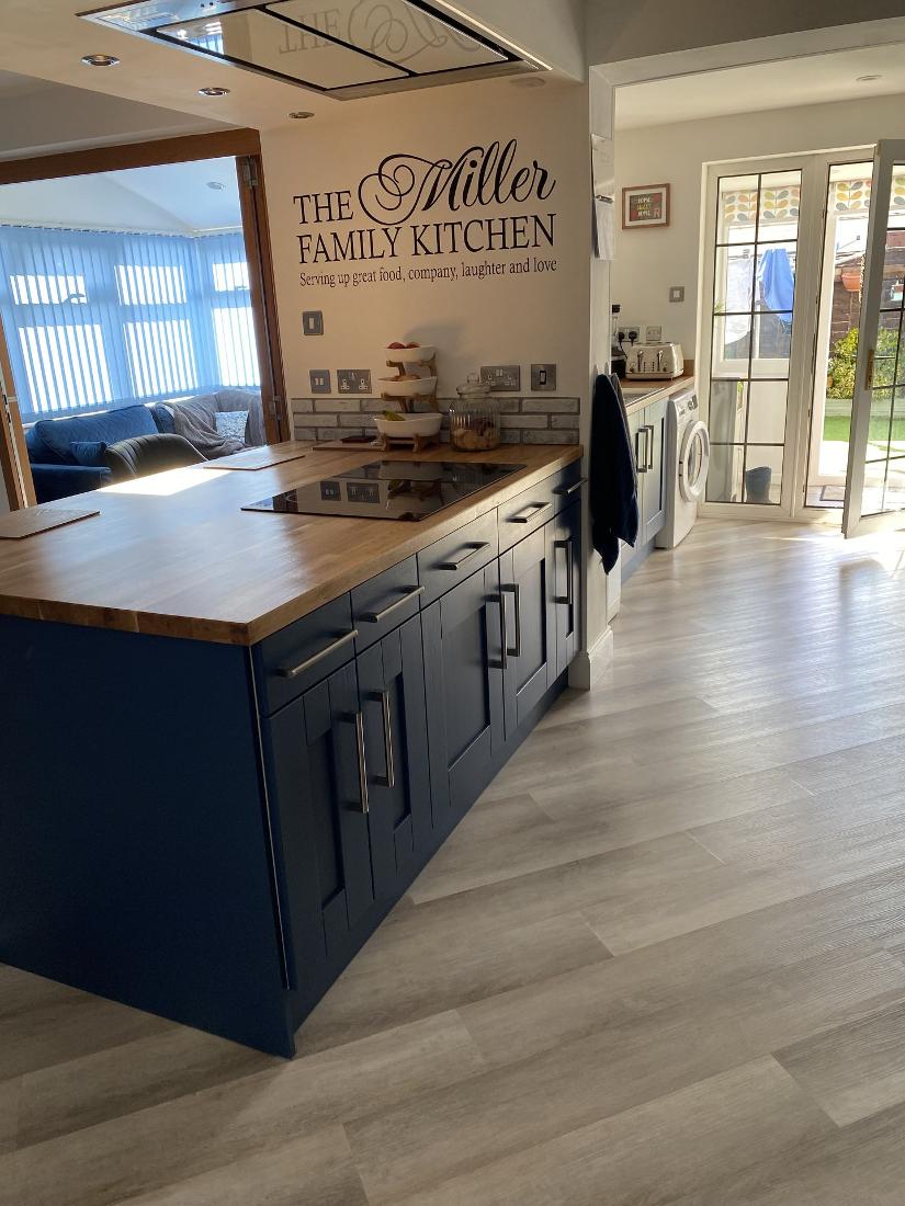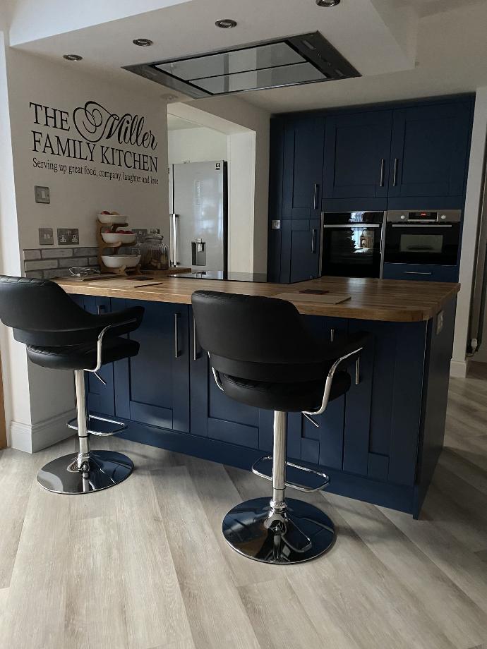 We’re delighted to showcase Julie’s charming Bowood Shaker kitchen in striking Eiffel Blue! Featuring a spacious peninsula with breakfast bar stools and personalised ‘The Miller Family Kitchen’ writing, it’s a welcoming family hub.