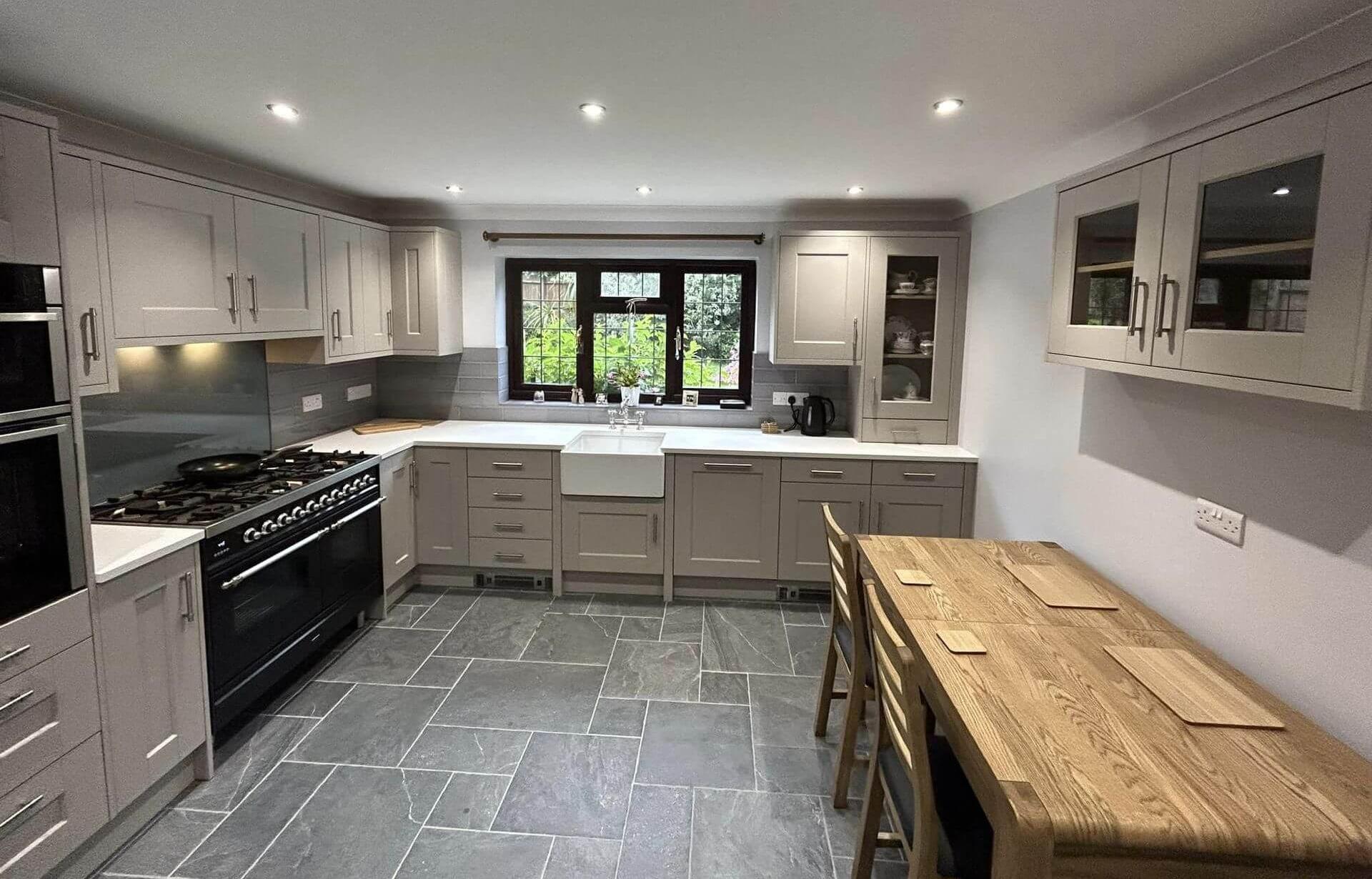 Grey slate tile flooring and oak dining table add warmth and texture, completing this beautifully designed space. Michael’s attention to detail and thoughtful choices have culminated in a kitchen that is both inviting and inspiring.