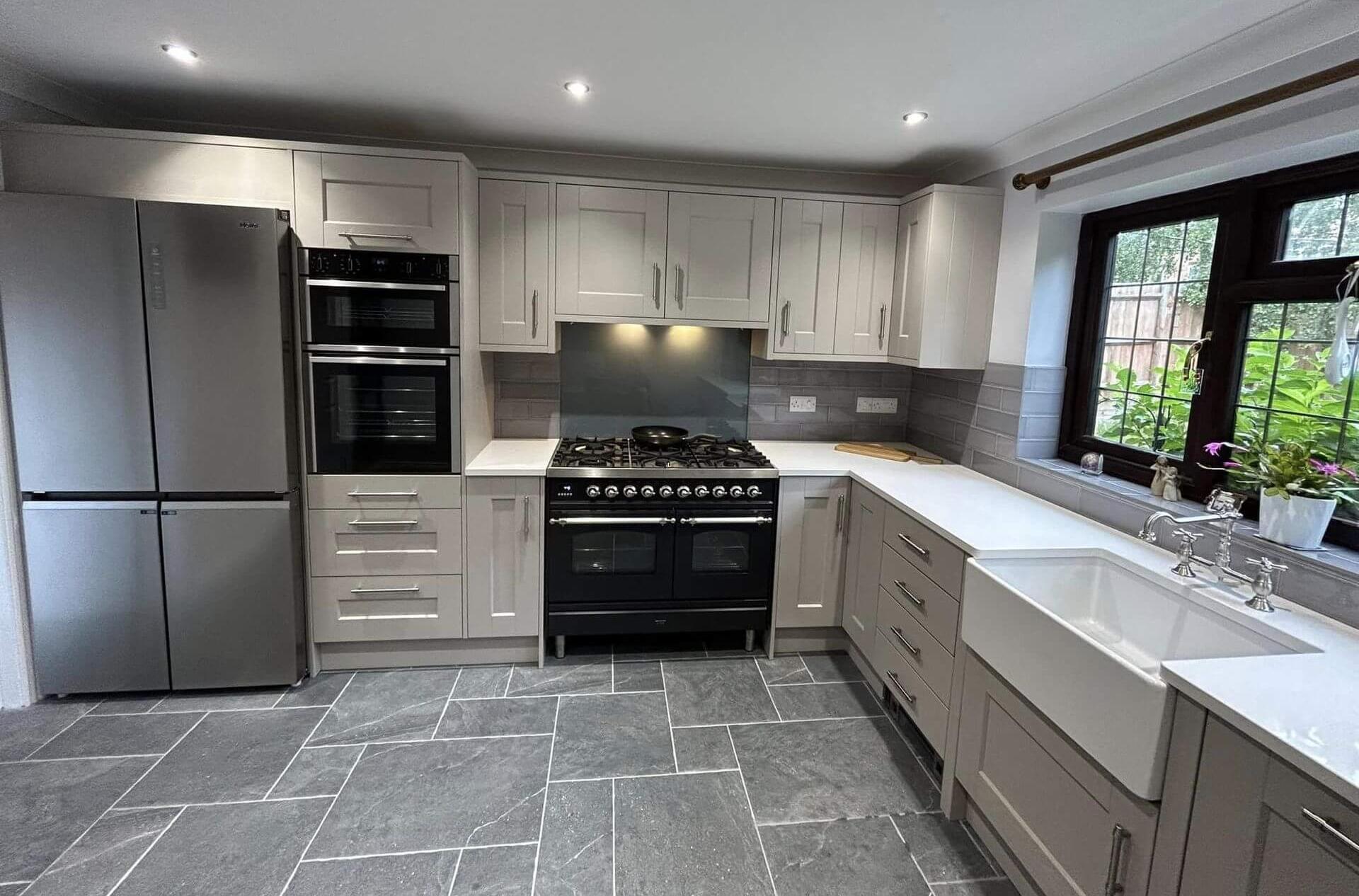 The black and stainless range cooker complements the oven and fridge, creating a cohesive and polished look. The Belfast sink, positioned perfectly under the window, offers a charming view of the garden, making every culinary endeavour a delight.