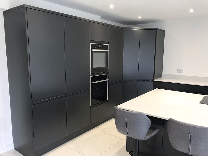 We are delighted to unveil Olivia’s chic Moderna Graphite kitchen! This handleless J-pull kitchen, with its matt finish, exudes contemporary elegance.