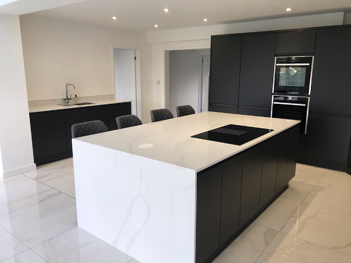The L-shaped layout, complemented by a large island and white marbled quartz worktops, creates a sophisticated and functional space. Grey padded stools on matte black legs add a stylish touch to the overhang.
