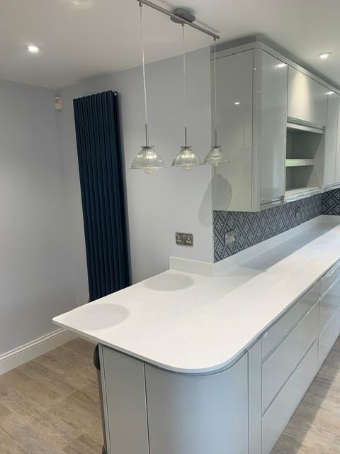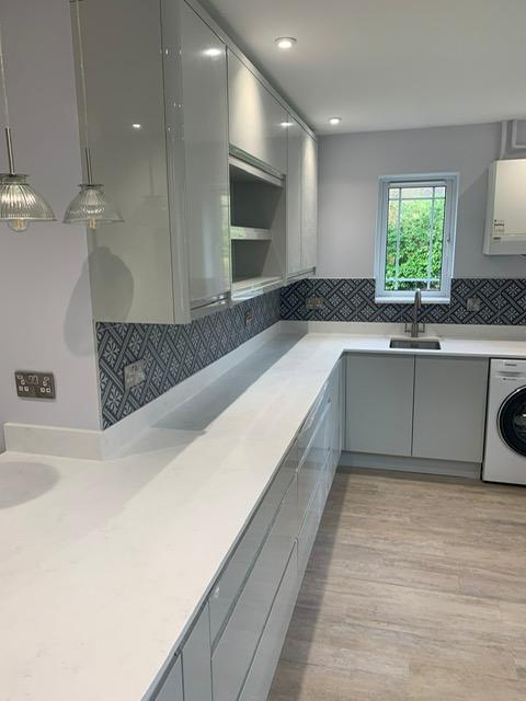 We are excited to showcase Richard’s sleek Ultimo Handleless kitchen in Light Grey Gloss! The U-shaped layout is complemented by pristine white worktops, creating a modern and airy feel.