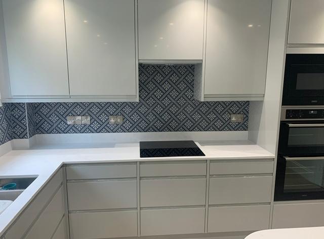 The blue and grey geometric tiles adorning the wall and splashback add a contemporary flair, while the neat black glass appliances and undermount sink in stainless steel complete the polished look of this stylish kitchen!