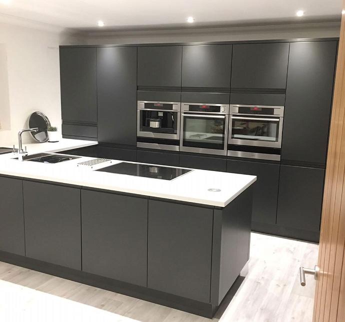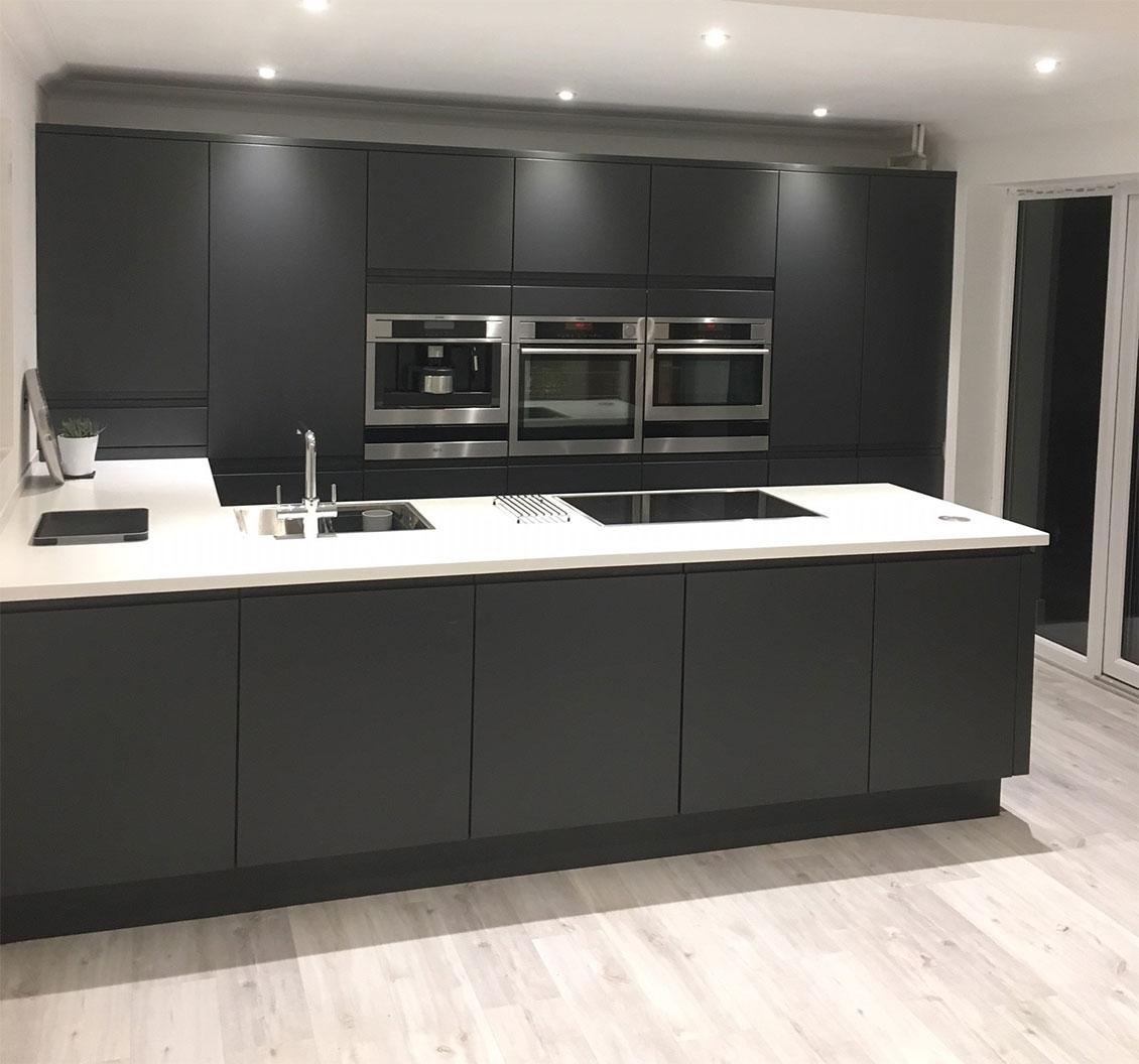We are excited to feature Sam’s spacious open-plan Moderna kitchen, finished in a sophisticated Graphite matt! The U-shaped layout is complemented by a dominating peninsula, cleverly housing both the sink and hob.