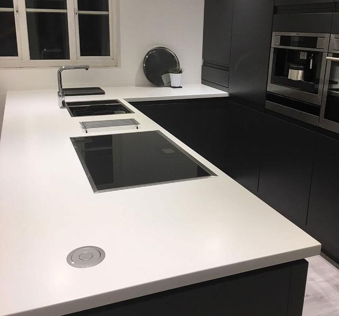 The crisp white worktops complete the modern and stylish look of this well-designed kitchen!