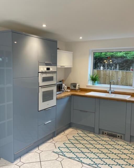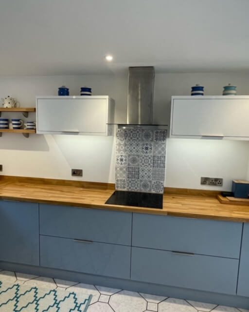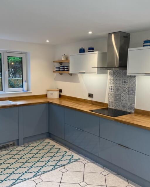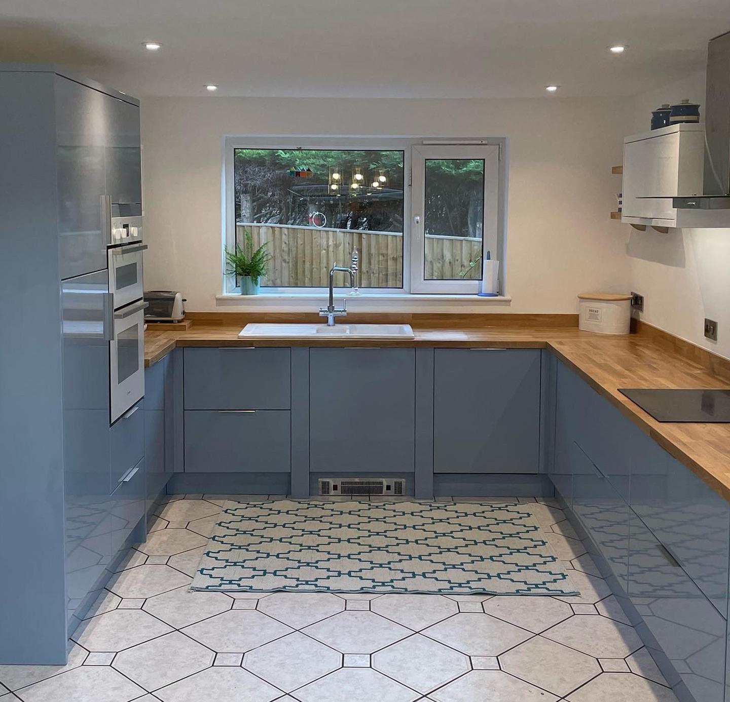 We’re excited to present Sharon’s sleek Lumino kitchen in Denim Blue Gloss! The oak worktops and upstands beautifully complement the modern glass extractor, flanked by wide bridging units.