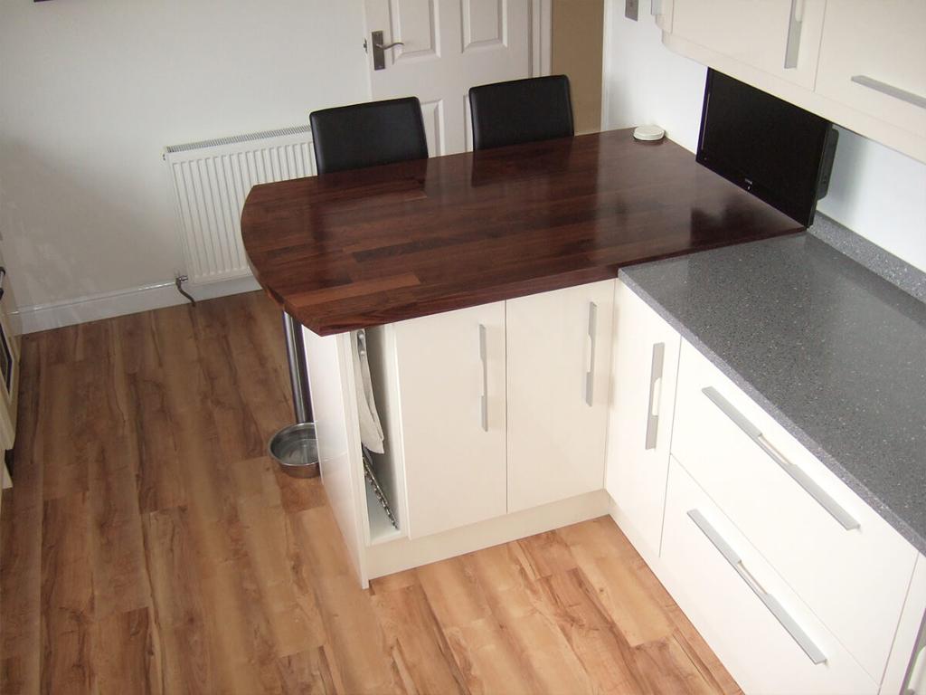 The addition of a walnut feature breakfast bar with stools not only provides more storage but also creates a functional and inviting space