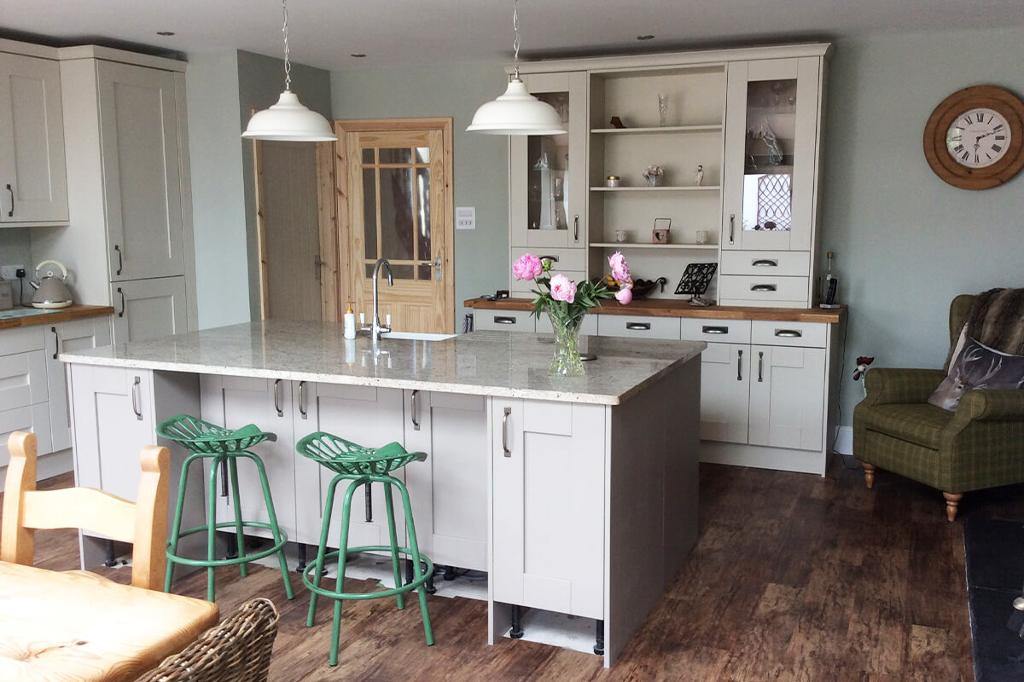 A large feature dresser with real walnut worktops creates a harmonious connection between the base units and dresser units.