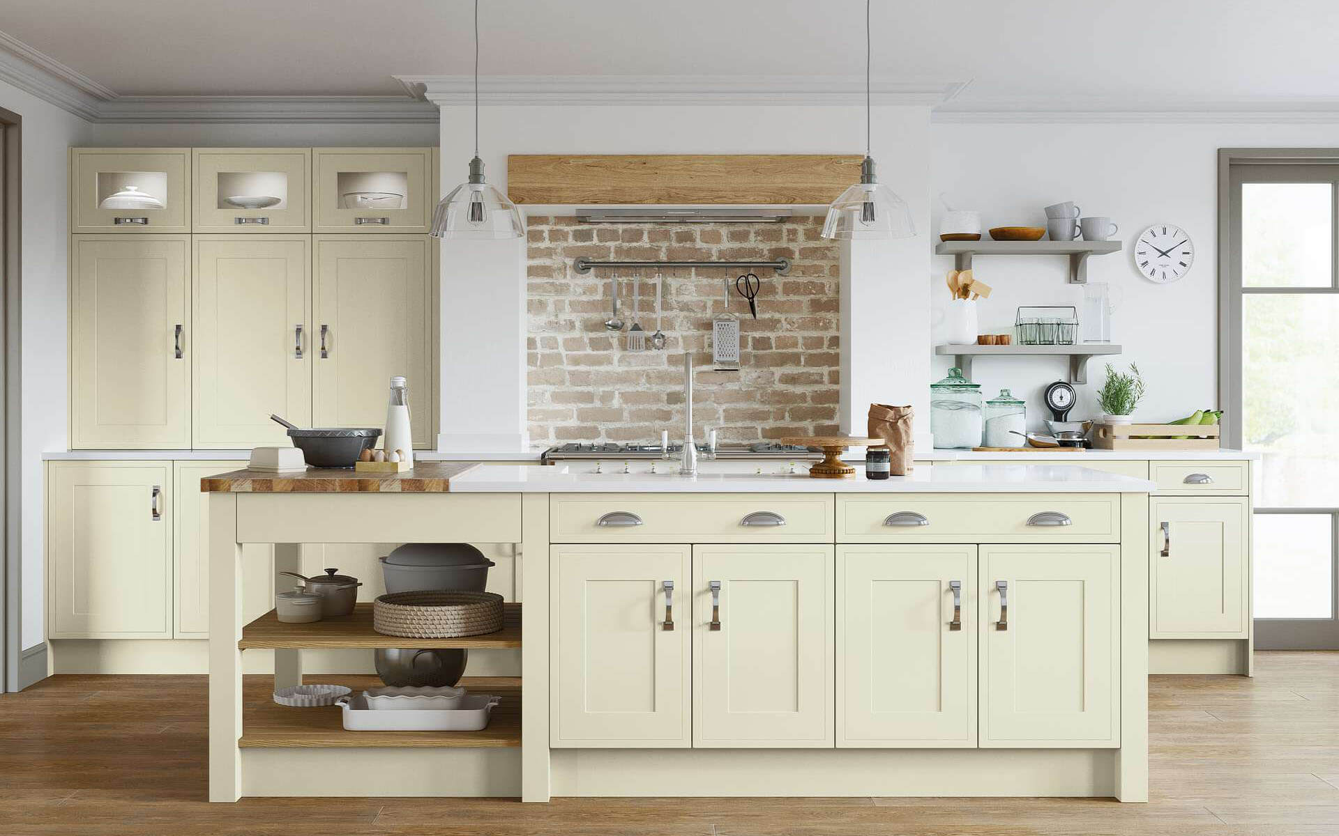 For a traditional, country-style kitchens, neutral colours with occasional colour highlights might be the best choice.