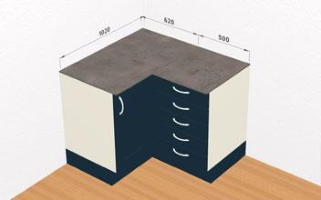 Corner units can be Left or Right handed, this is determined by side of the unit that has the opening door. The opposite side will have a Blanking Panel made from carcase material.