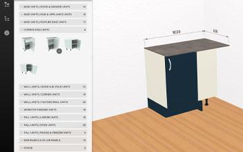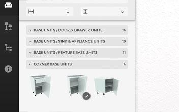 A list of available kitchen units is now displayed in unit groups. Click on Corner Base Units or Corner Wall Units group to expand the display and a list of available units will appear.
