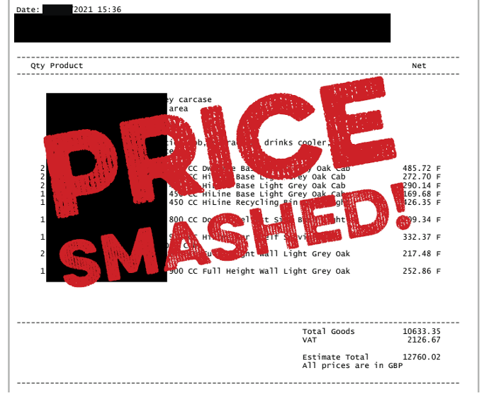 The Customer’s original quote came to £13,210, a lot of which was appliances. We added everything together and came up with a direct like-for-like comparison that saved the customer a massive 23% off their originally quoted price.
