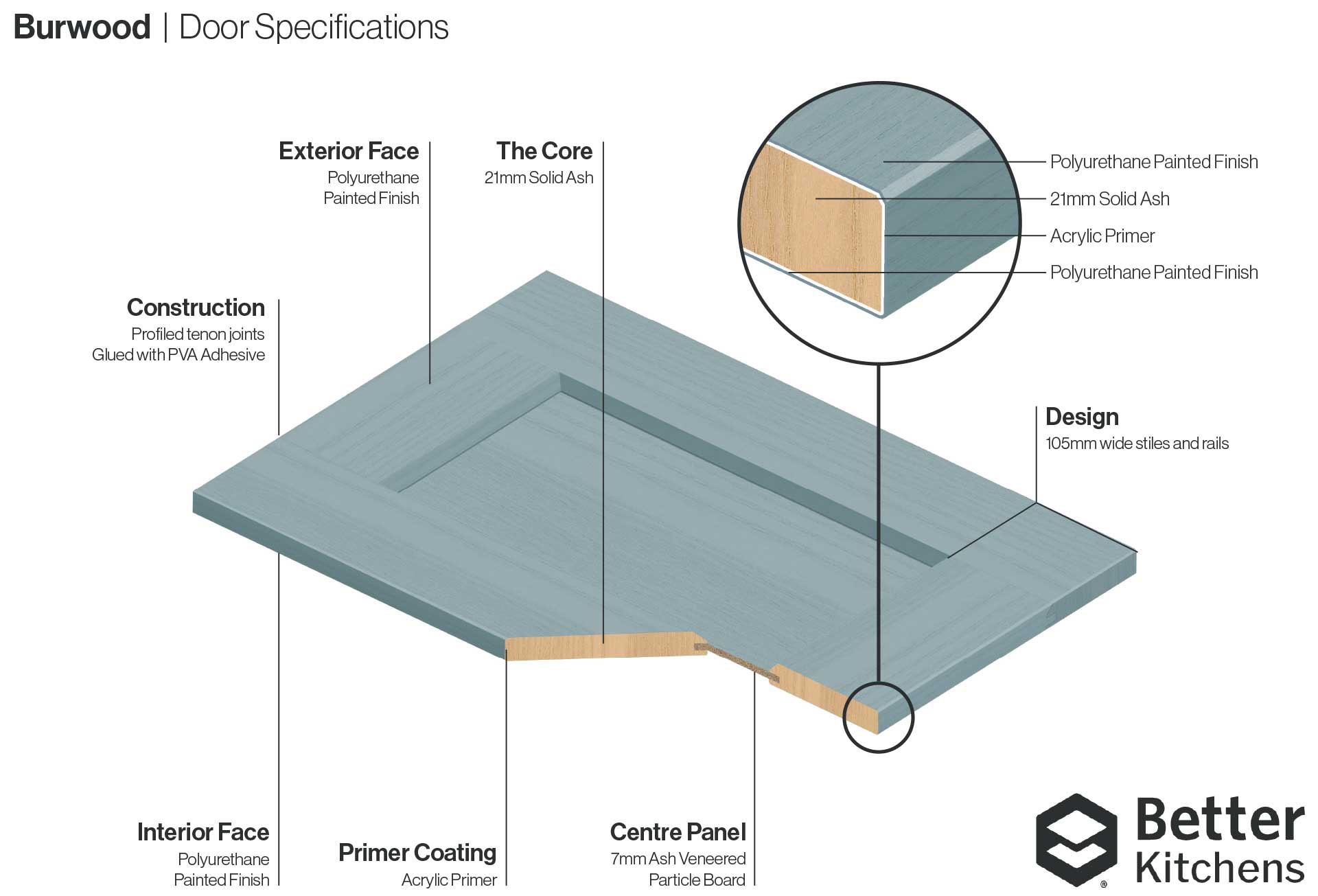Burwood (Premium Colours) is a chunky shaker door consisting of a solid Ash hardwood frame and Ash veneered centre panel.