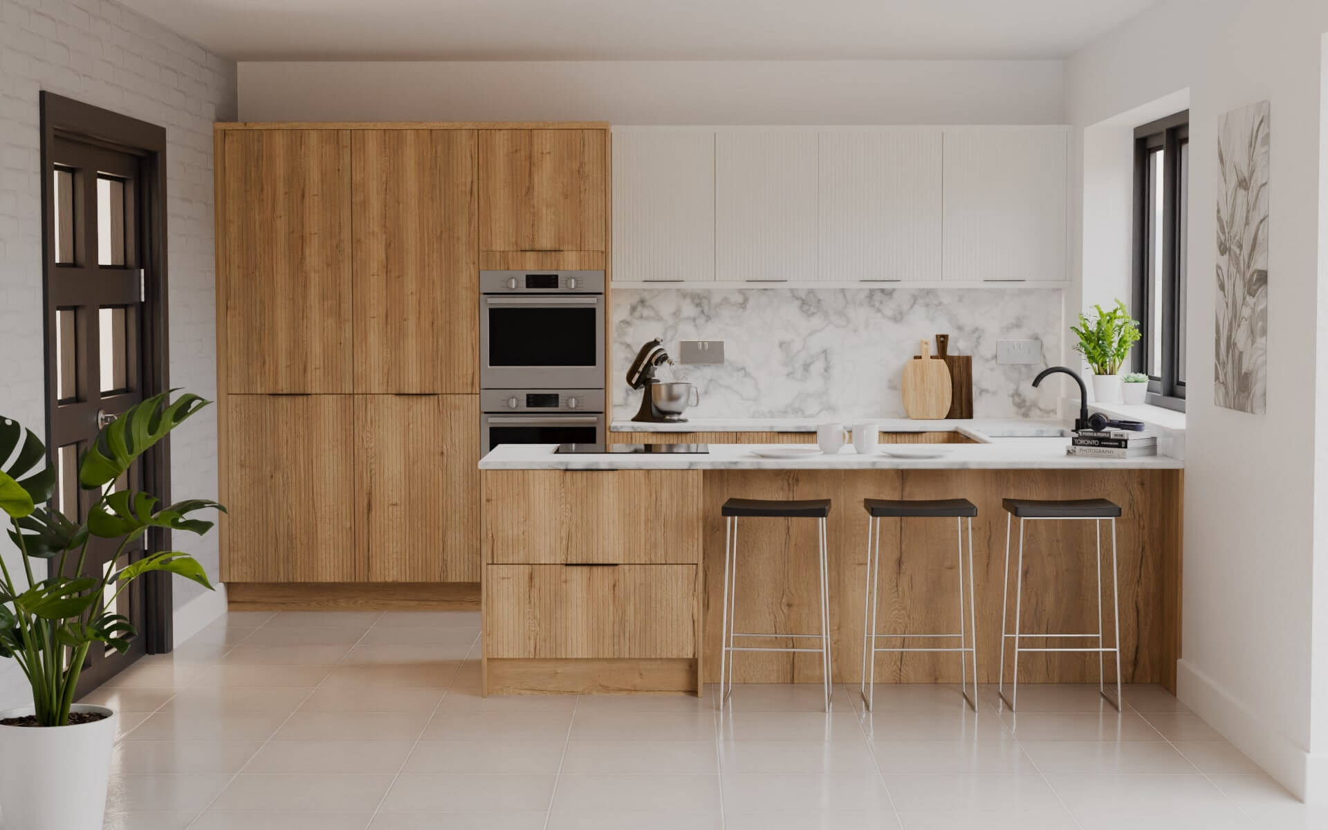 Texture brings subtle variation to an otherwise minimal kitchen. You might use a woodgrain cabinet finish, ribbed glass, or quartz worktops with a slight grain. These help avoid a sterile feel without losing the benefits of a modern style.