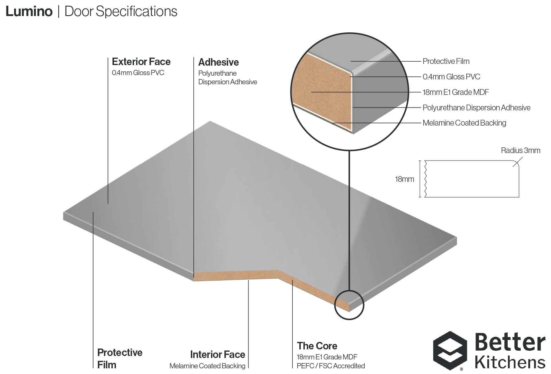 Gloss slab door with small radius edge detail, 18mm thick vinyl wrapped MDF.