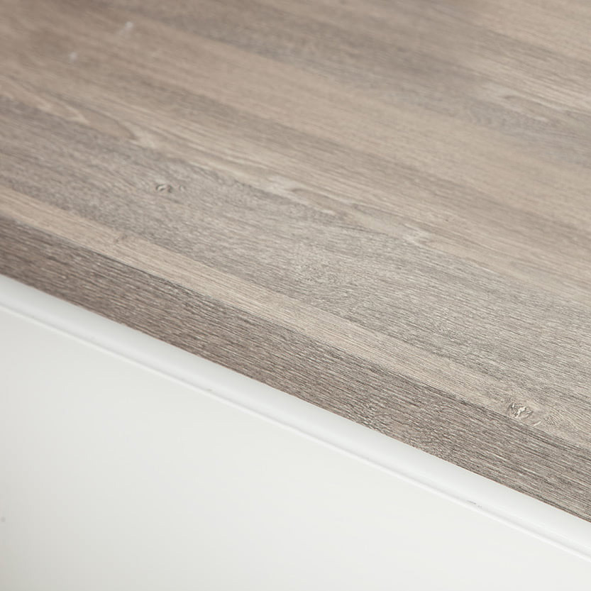 These countertops feature a delicate aged timber design with a realistic textured wood grain finish to enhance the authentic wood effect. Our Silver Oak laminate worktops are easy to clean and maintain as well as long-lasting thanks to their hard-wearing and water-resistant decorative laminate top layer.